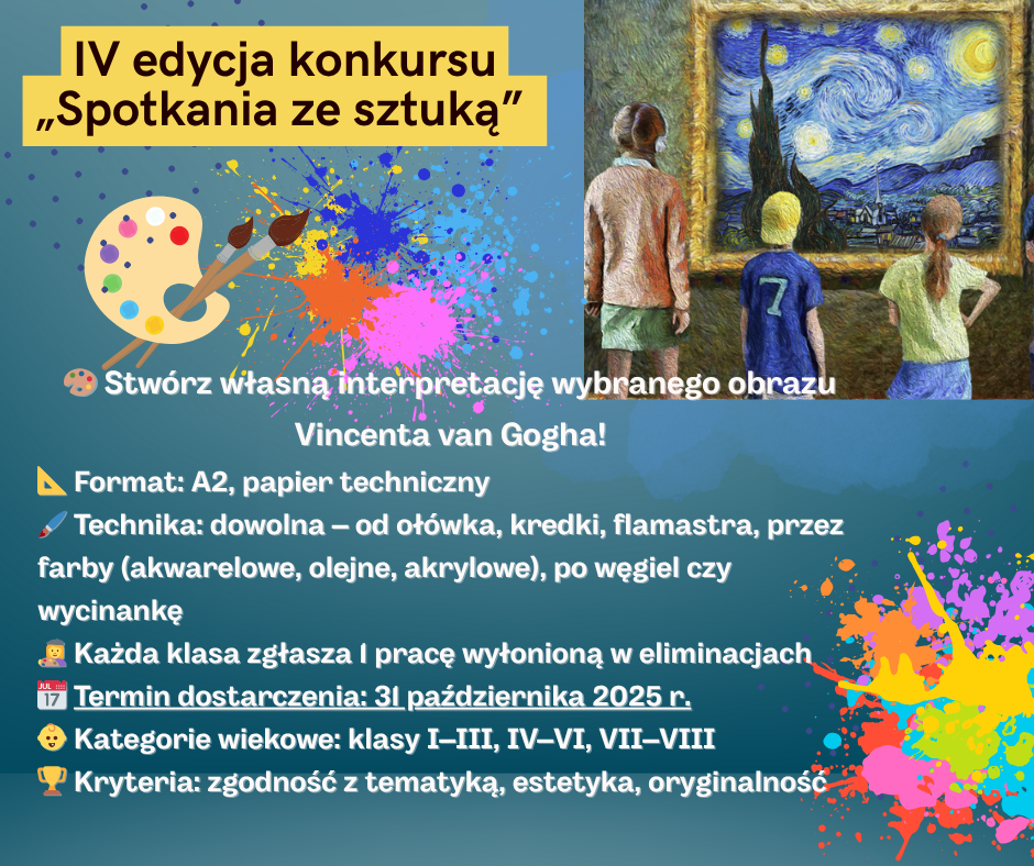 Fundacja PGE po raz czwarty zaprasza uczniów szkół podstawowych z całej Polski do udziału w konkursie plastycznym „Spotkania ze sztuką”. Tegoroczna edycja poświęcona jest twórczości Vincenta van Gogha – jednego z najbardziej rozpoznawalnych artystów w historii malarstwa. Celem konkursu jest nie tylko rozwijanie wyobraźni i kreatywności dzieci i młodzieży, ale także popularyzacja wiedzy o sztuce oraz zachęcanie do aktywnego uczestnictwa w kulturze.